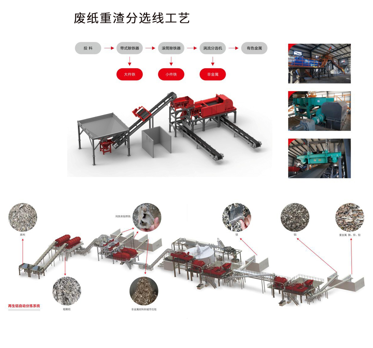 利用隆基技術優勢,根據客戶不同現場條件和物料類別,進行合理有效的工藝布局和產品制造,達到從鋁廢料中分離出非金屬和鐵、銅、鋅、鉛、鎂等金屬。分選后的鋁廢料能達到直接熔煉的要求。
